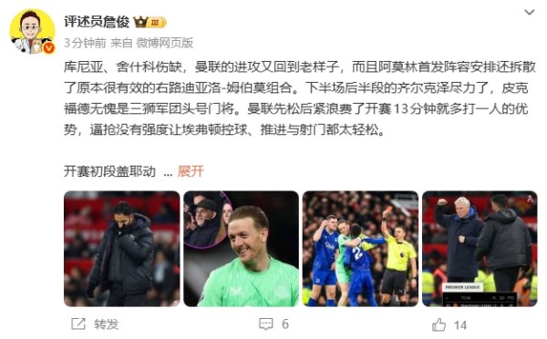 11月25日讯 曼联本轮0-1不敌十东说念主埃弗顿,赛后,驳倒员詹俊发文点评。 詹俊: 库尼亚、舍什科伤缺,曼联的关键又回到老神色,况且阿莫林首发气势安排还拆散了正本很有用的右路迪亚洛-姆伯莫组合。下半场后半段的皆尔克泽勉力了,皮克福德无愧是三狮军团头号门将。曼联先松后紧迫害了开赛13分钟就多打一东说念主的上风,逼抢莫得强度让埃弗顿控球、鼓吹与射门都太放浪。 开赛初段盖耶动手打脸迈克尔-基恩被红牌罚下,这让东说念主思起二十年前纽卡的鲍耶与戴尔场上宣战双双拿红牌,三十年前布莱克......查看更多