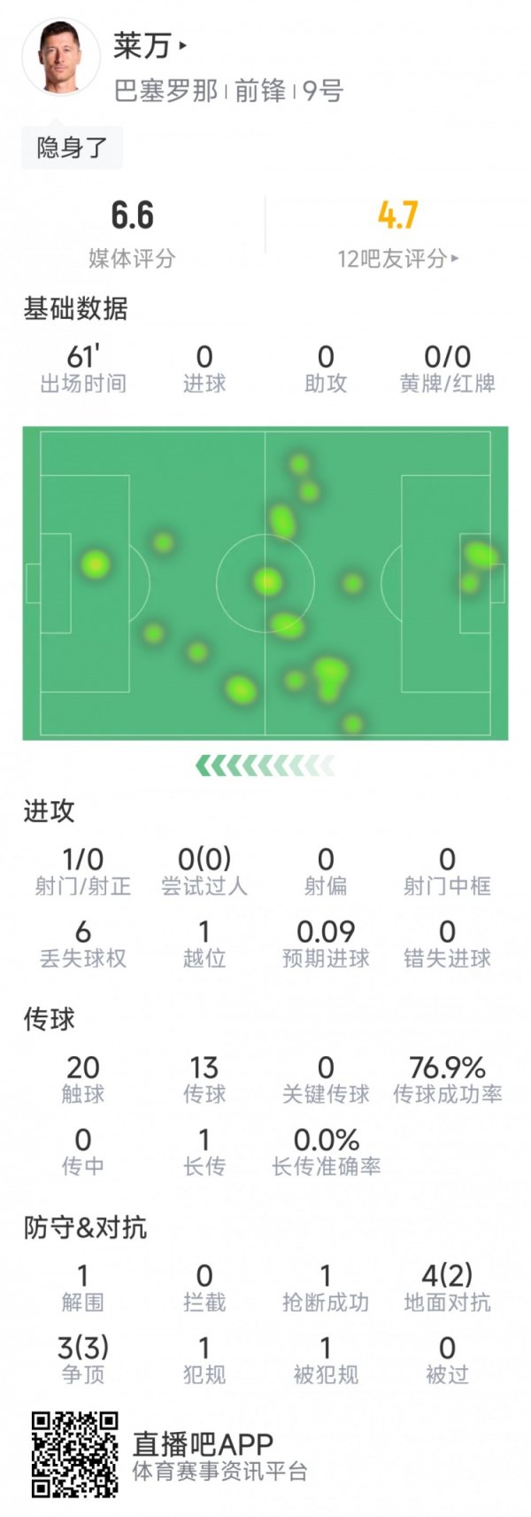 契机寥寥,莱万本场数据:1次射门0射正,7回击5见效,评分6.6分