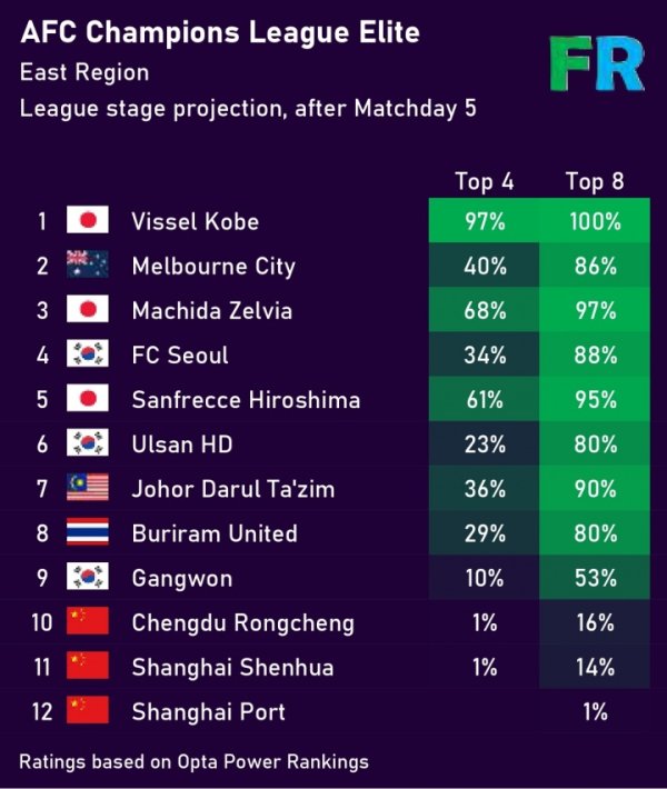 但愿茫乎!亚冠精英淘汰赛晋级概率:海港仅剩1%,蓉城16%申花14%
