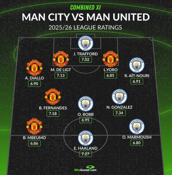 曼市德比本赛季评分最高阵:哈兰德领衔曼城6东谈主,姆伯莫在列
