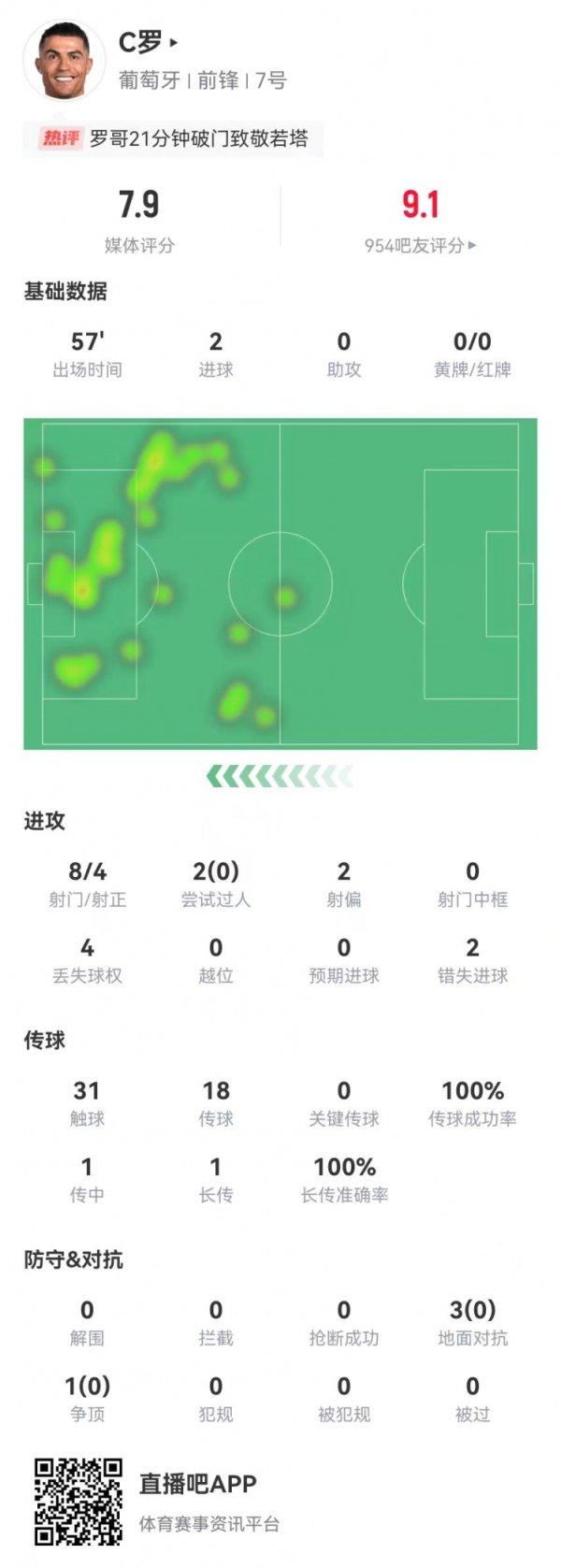 梅开二度!C罗本场8射4正进2球,18传球全奏效,获评7.9分