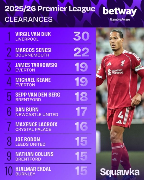 本赛季英超突围榜:范迪克30次居首,塞内西22次第二