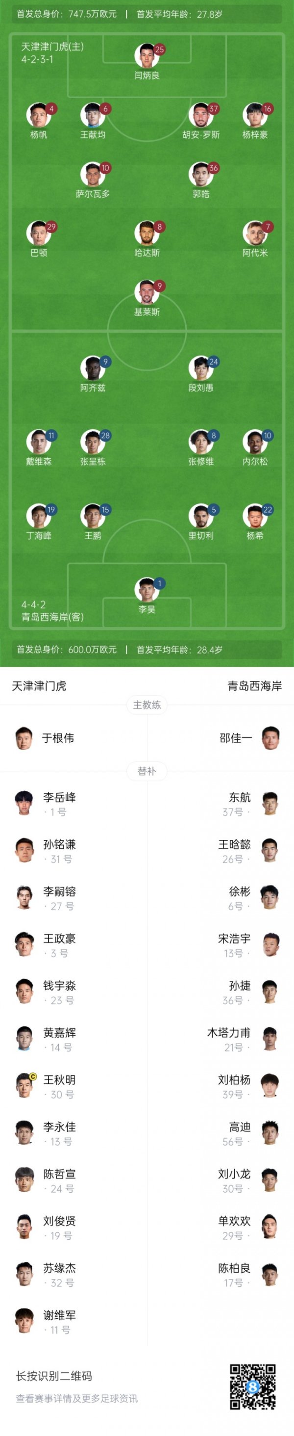 津门虎vs西海岸首发:5外助PK4外助!萨尔瓦多先发,段刘愚出战