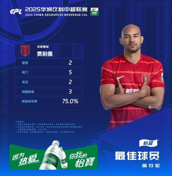 官方:成齐蓉城时尚费利佩当选中超第19轮最好球员