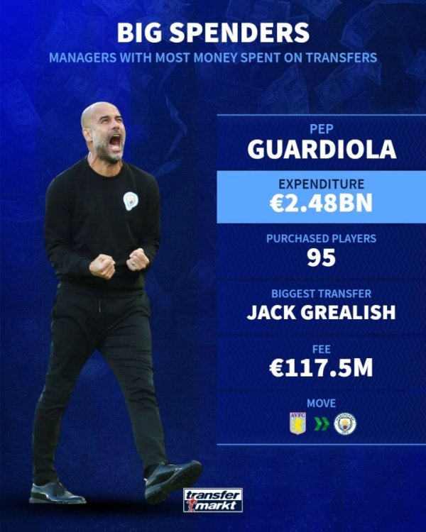 07月31日讯 德国转会市集网站统计了足球主西席在转会市集的参加排名,瓜迪奥拉以24.8亿欧元排名第一,穆里尼奥、安切洛蒂位列前三。 足球主西席引援破耗排名榜: 1-瓜迪奥拉,24.8亿欧,签下95东谈主,格拉利什最贵,1.175亿欧 2-穆里尼奥,19.6亿欧,签下131东谈主,博格巴最贵,1.05亿欧 3-安切洛蒂,18.3亿欧,签下126东谈主,贝林厄姆最贵,1.13亿欧 4-西蒙尼,15.2亿欧,签下98东谈主,菲利克斯最贵,1.272亿欧 5-阿莱格里,14.8亿欧......查看更多