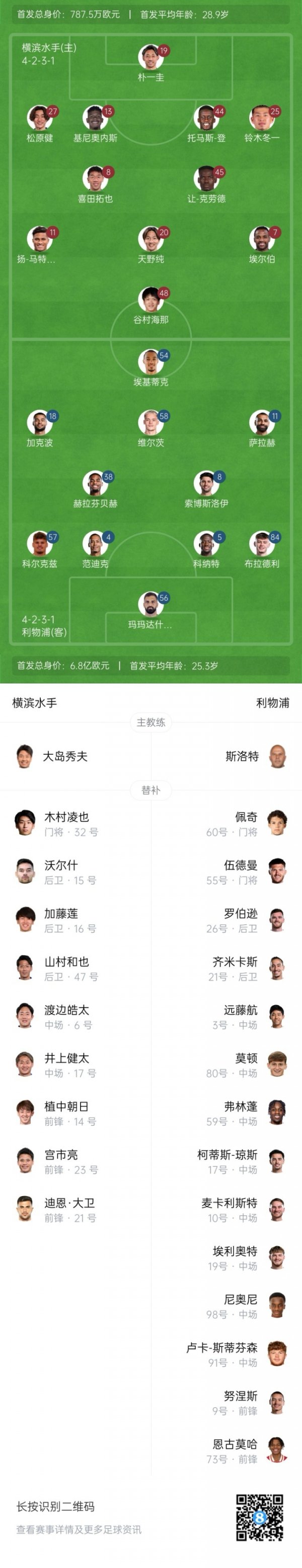 利物浦vs横滨水手首发:维尔茨、萨拉赫领衔;埃基蒂克首秀