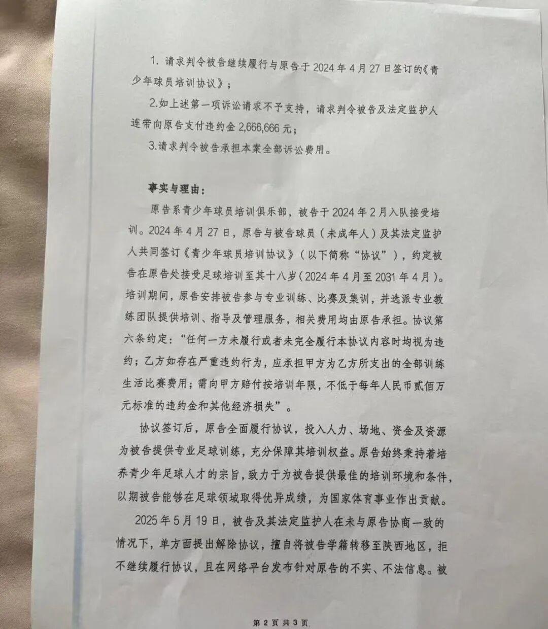 本年12岁的张卓毅,是又名签约青训球员,2024年4月27日,其家长与嗨球青训(以下简称嗨球)顽强《青少年球员培训条约》,其中商定,嗨球免费培养,张卓毅要在嗨球踢到18岁。自本年头以来,张卓毅家长与嗨球屡次协商解约未果。尔后,张母在收罗上“控诉”嗨球索求“18万元天价背信金”。之后,嗨球拿起民事诉讼索赔266万余元。