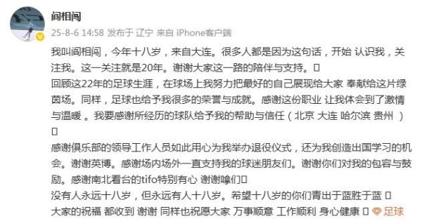 阎相闯退役感言:牵记这22年的生计,这份处事让我体会心思与讲理